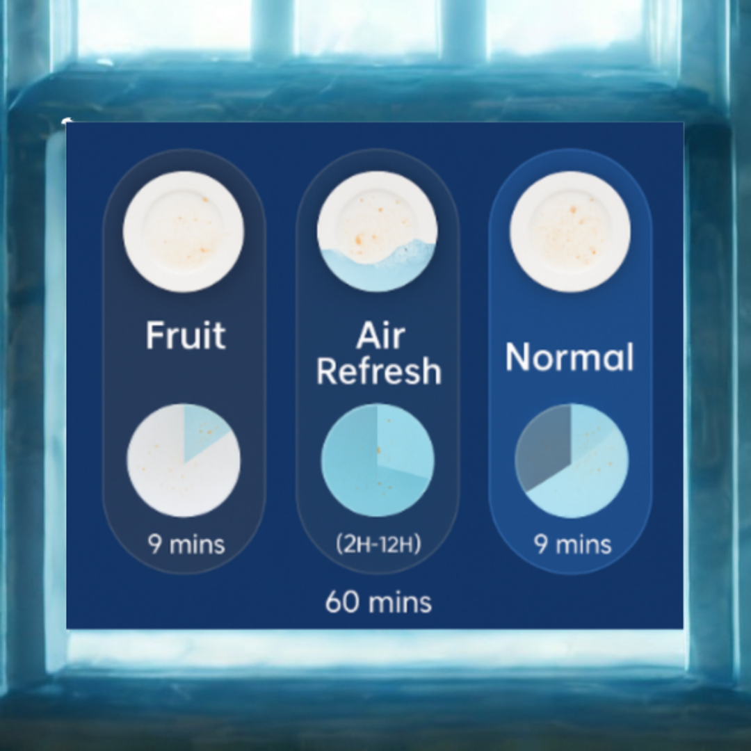 This dishwasher is equipped with multiple cleaning programs tailored to different needs. Enjoy a quick 9-minute Fruit Wash for gentle rinsing, an Air Refresh cycle running 2 to 12 hours to keep dishes odor-free, and a 9-minute Normal Wash for everyday convenience. Additional specialized modes handle both delicate items and heavy-duty loads, giving you efficient, adaptable performance for any dishwashing task.