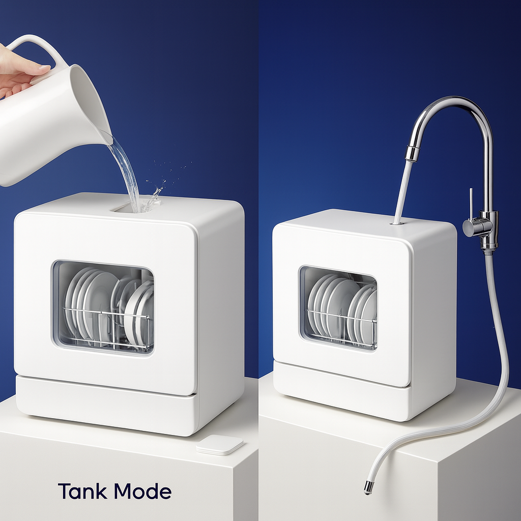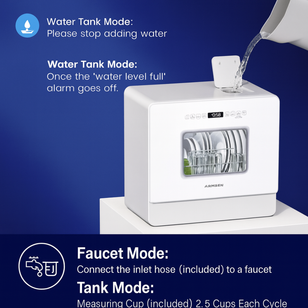 Enjoy ultimate flexibility with two convenient ways to use your dishwasher. Connect directly to your kitchen faucet with the Faucet Mode, or use the built-in Tank Mode with a measuring cup—no permanent installation required. Perfect for apartments, condos, or small spaces, giving you hassle-free dishwashing anytime, anywhere.