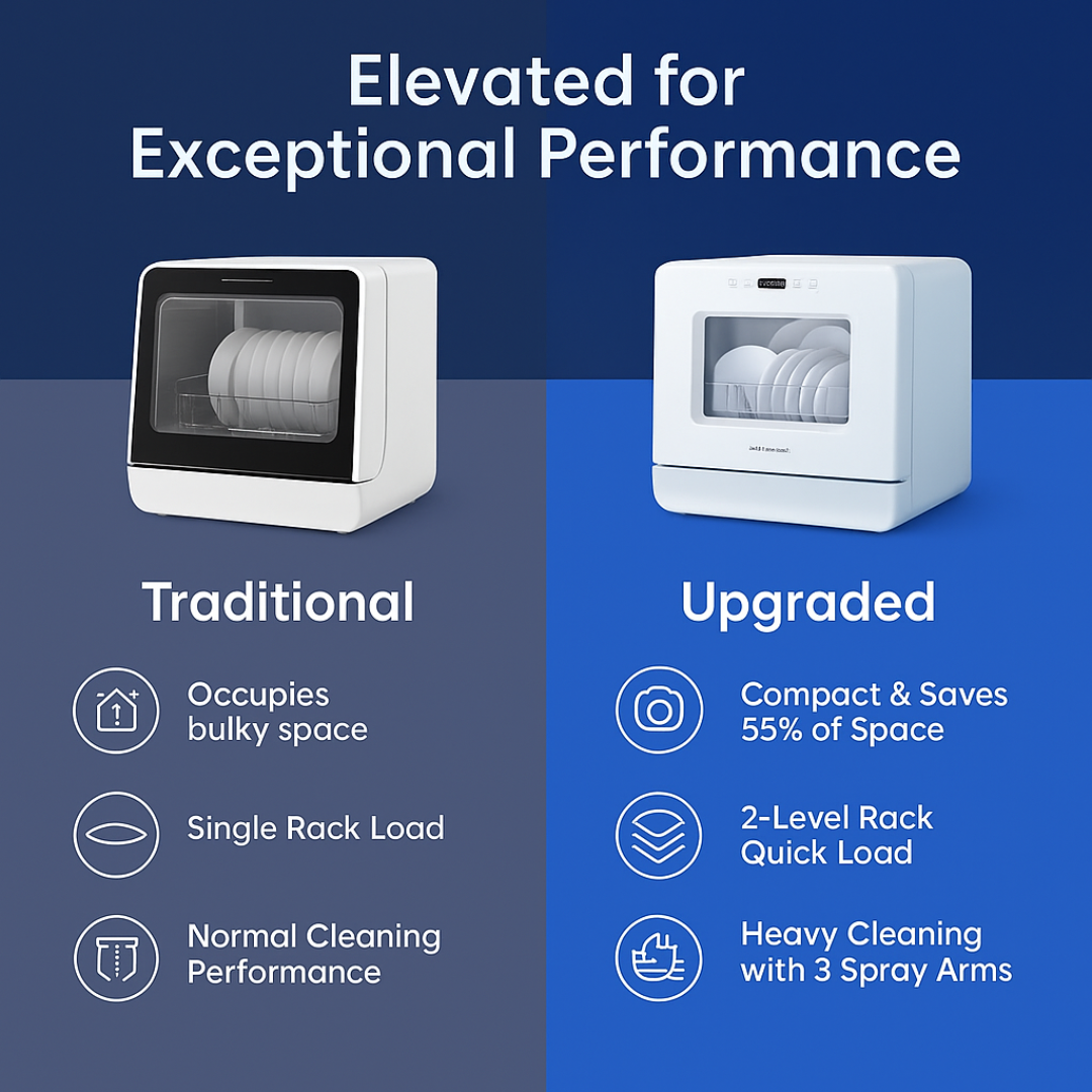 Upgrade your kitchen with a compact dishwasher that saves 55% more space while delivering superior cleaning power. Unlike traditional single-rack models, the upgraded design offers a 2-level quick load system and 360° spray arms for heavy-duty cleaning and faster results—making it the smarter, more efficient choice for modern households.