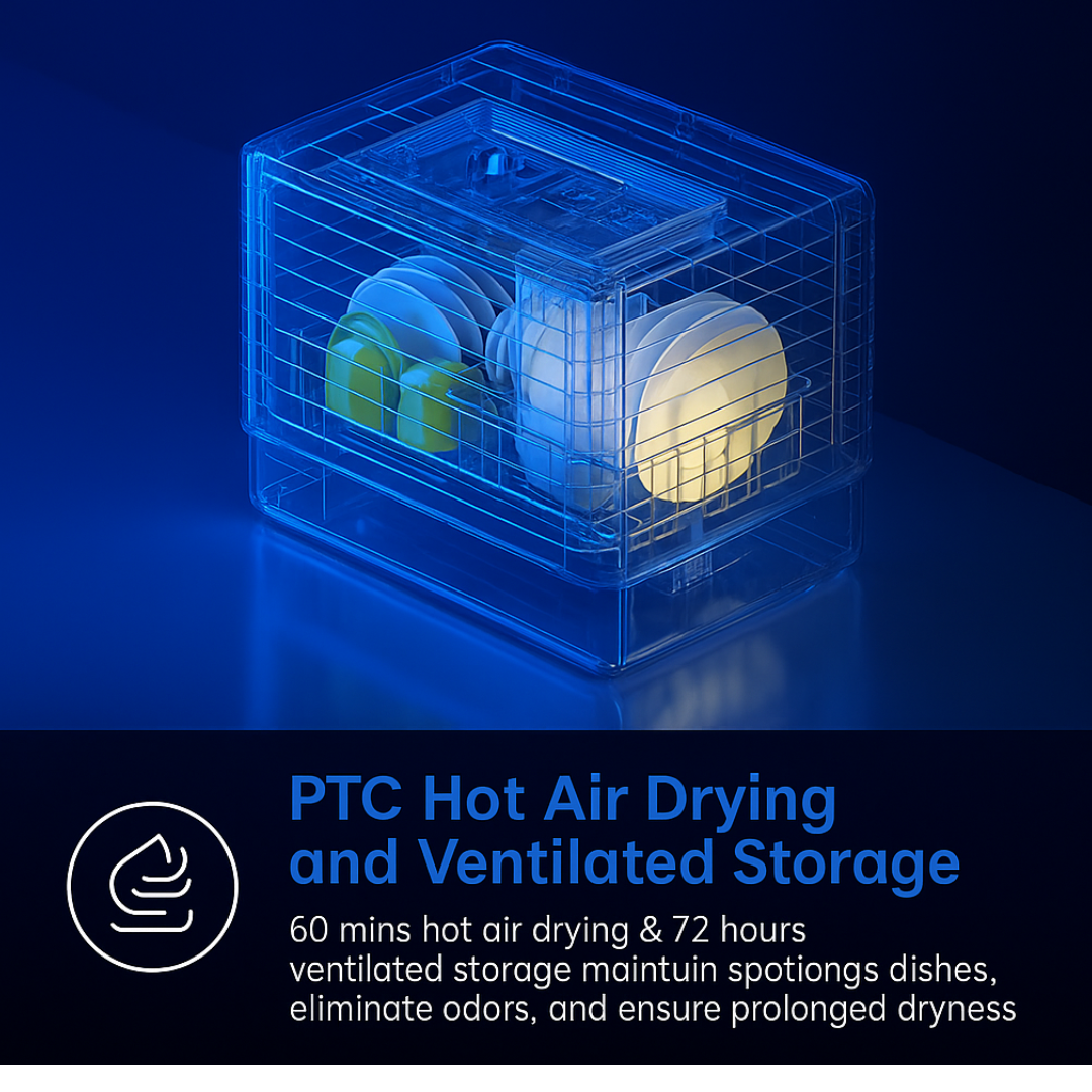 Keep your dishes clean, dry, and fresh with advanced PTC hot air technology. A powerful 60-minute drying cycle ensures every plate, cup, and utensil comes out perfectly dry, while up to 72 hours of ventilated storage prevents moisture and odors—so your dishes are always ready to use when you need them.